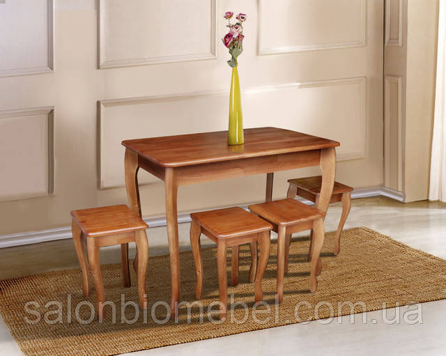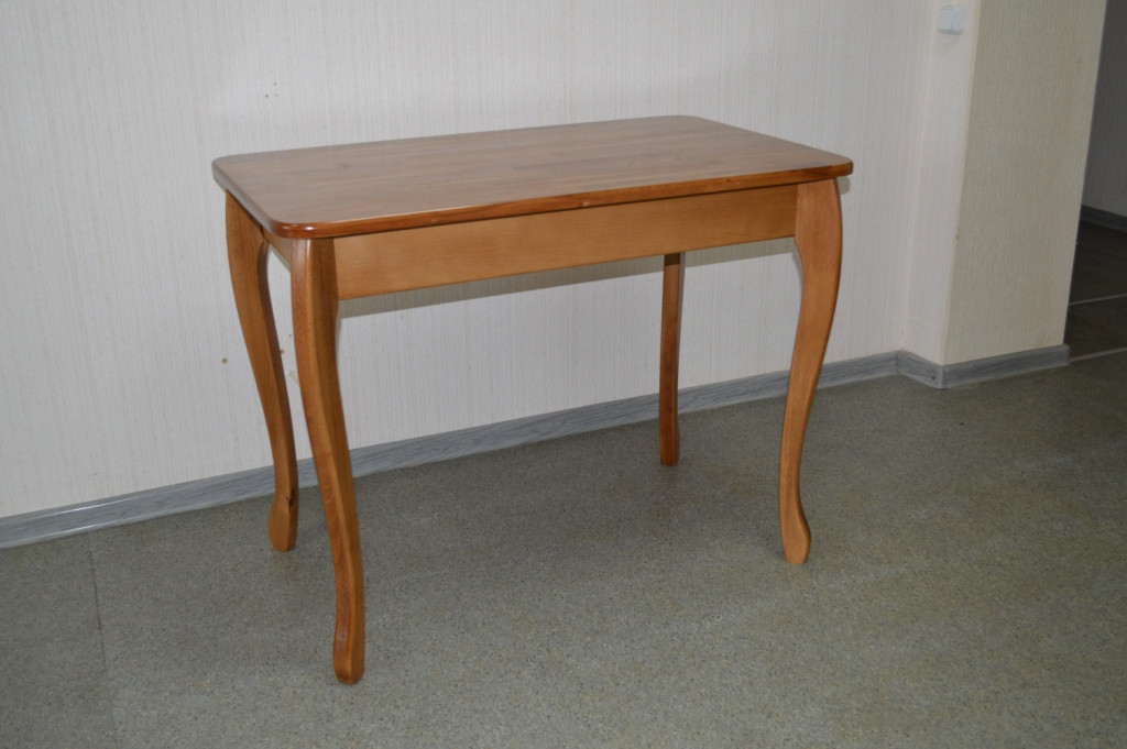 Компактний дерев'яний стіл на гнутих ніжках, покритий якісним поліуретановим лаком для стільниць.